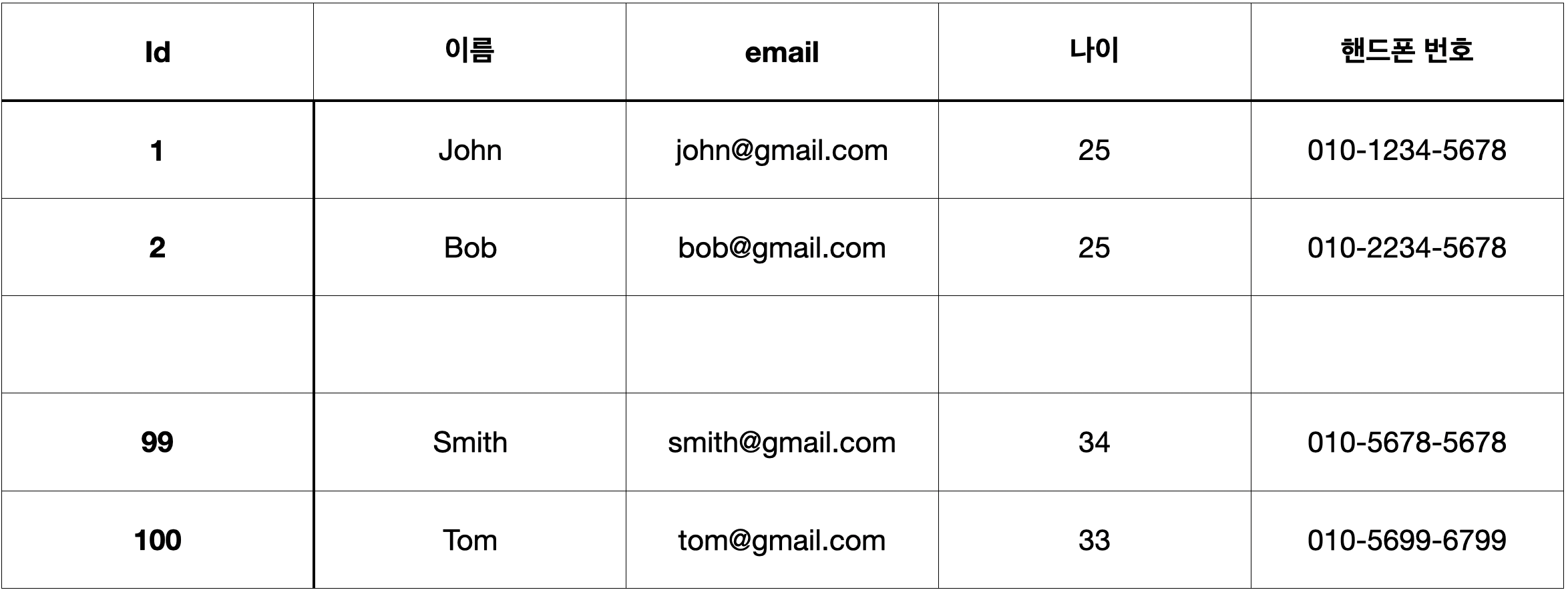 들어가며Database Indexing은 최신 데이터베이스에서 효율적인 데이터 검색을 위해 필수적이다. 기본키를 통해 레코드를 찾을 때 Index가 적용되어 결과를 빠르게 찾을 수 있다. 10만개가 넘는 데이터 중 내가 원하는 값을 가져오는데 시간이 매우 적게 든다면 더욱더 빠른 서비스를 제공할 수 있을 것이다. 이제 Index를 사용할 수 있도록 인덱스가 무엇이고, 어떻게 사용하는지 알아보자. Index는 얼마나 빠르지?설명을 위해 ID, Email, 이름, 나이, 핸드폰 번호라는 속성이 있는 간단한 전화번호부 테이블을 생각해보자. 테이블에서 데이터는 행으로 구성되며 각 행은 Record이다. 열은 레코드의 속성이나 특성을 정의한다. 100개의 데이터가 있는 테이블에서 내가 원하는 조건을 가지는 데이터..